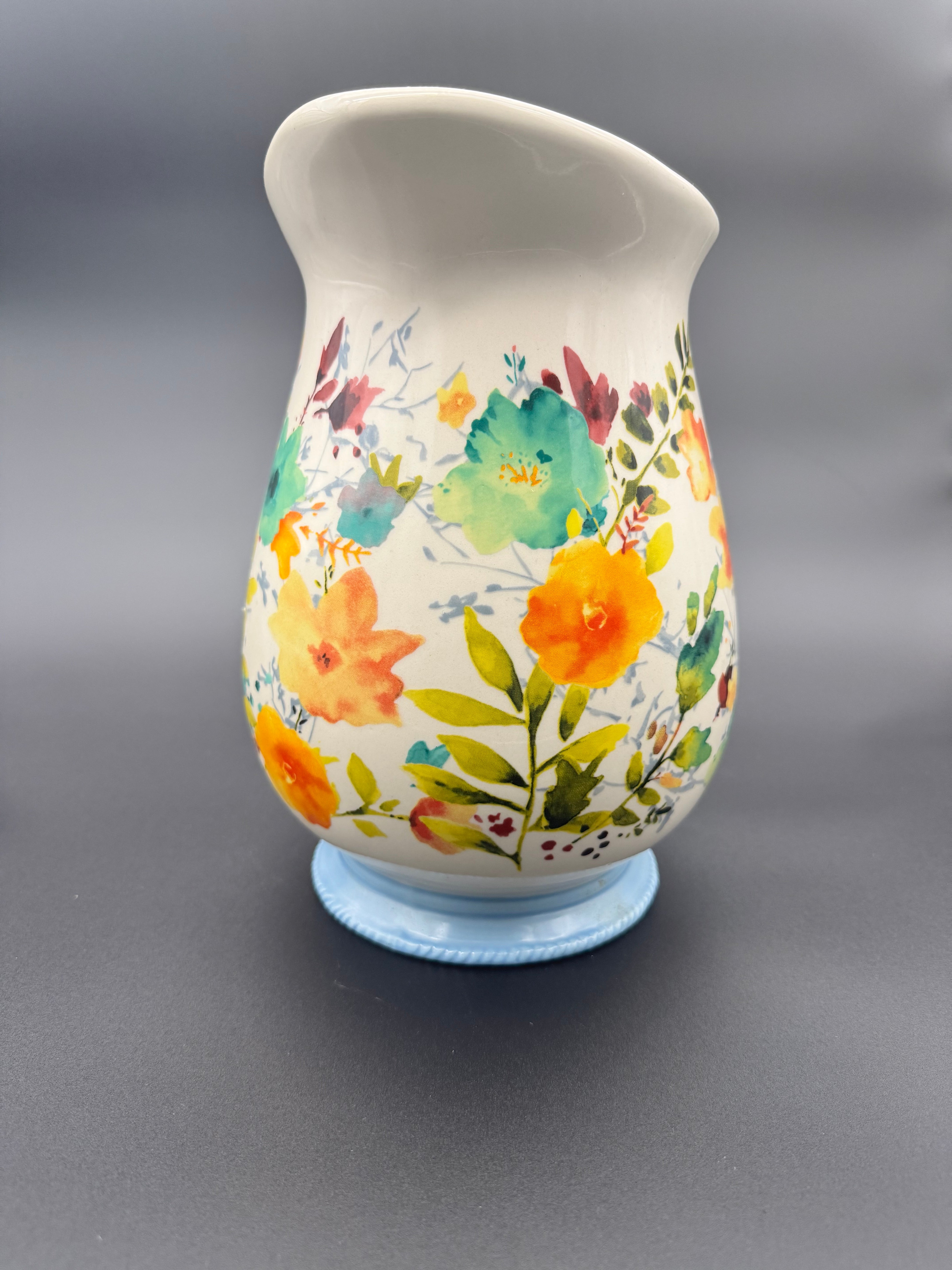 Spring Meadow – Cream ceramic with colorful floral motifs and a pale blue handle and base
