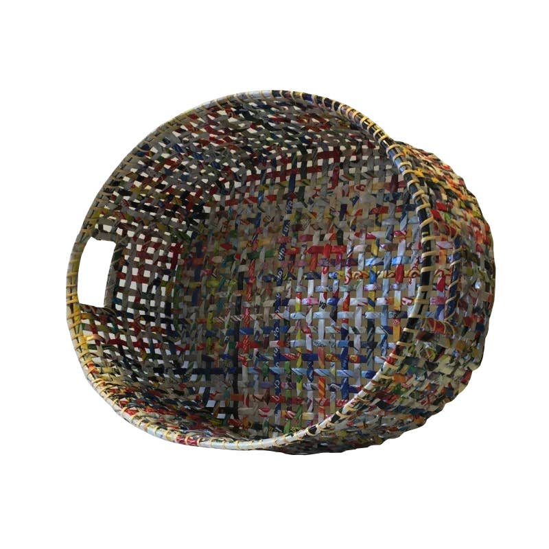 Each strip of reclaimed magazine paper is individually coiled and secured, creating a sturdy yet lightweight form rich in color, pattern, and layered detail. Because every basket is made from different printed materials, no two are ever identical — each carries its own subtle story.