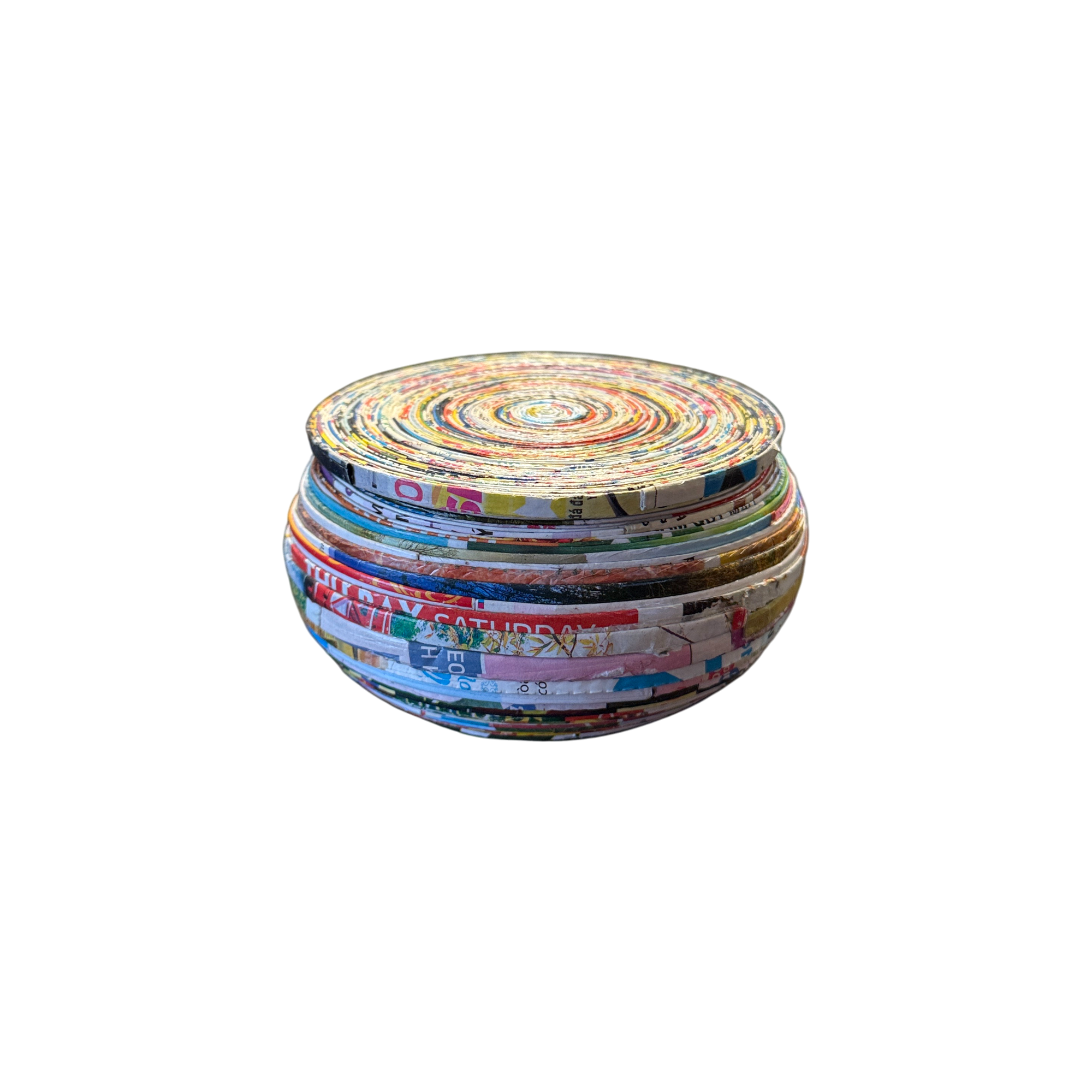 Each strip of reclaimed magazine paper is individually rolled, layered, and secured by hand, forming a tightly coiled surface full of color, depth, and subtle variation. The fitted lid rests gently on top, adding structure while enhancing its sculptural form.