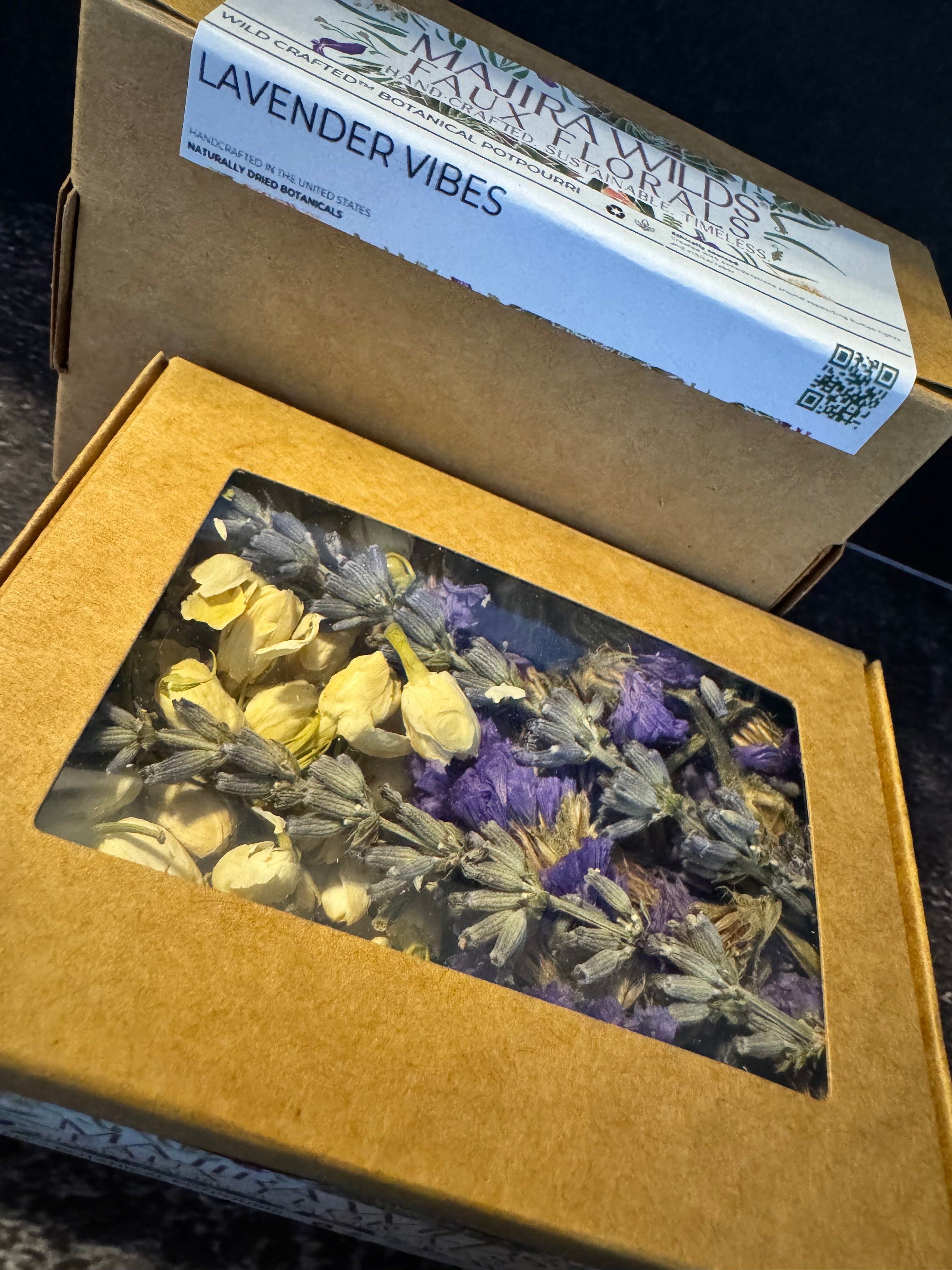 A soothing composition centered on dried lavender buds and soft, neutral botanicals. Thoughtfully styled to invite stillness and reflection, this blend is ideal for bedrooms, baths, and quiet spaces where calm is meant to linger.